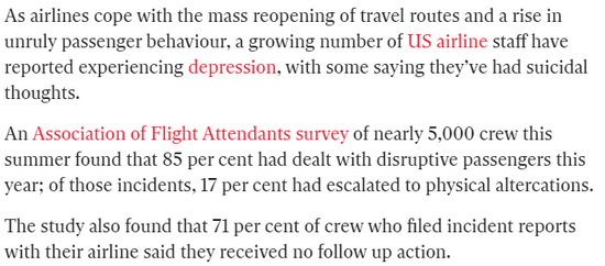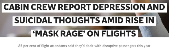 此外,据英国《独立报》报道,随着航空公司应对大规模重新开放航线和乘客不守规矩行为的增加,越来越多的美国航空公司员工报告称自己患有抑郁症,一些人说他们有自杀的想法。