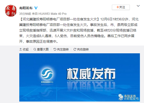 2020年4月5日,正值清明假期,河北邢台金域华府工地突然起火,浓烟滚滚。工地工作人员介绍,火着了几间工人宿舍,当时宿舍没人。邢台金域华府房地产开发有限公司称,工人都没事,原因是工人的手机在被子底下充电起火。