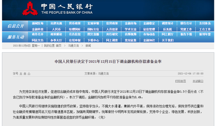 中国人民银行决定于2021年12月15日下调金融机构存款准备金率0.5个百分点(不含已执行5%存款准备金率的金融机构)。本次下调后,金融机构加权平均存款准备金率为8.4%。详情:央行宣布!