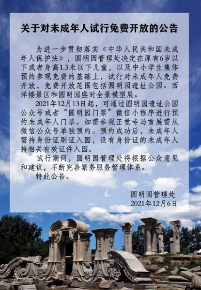 12月6日,圆明园管理处发布关于对未成年人试行免费开放的公告。公告内容显示:12月13日起,景区对未成年人试行免费开放。