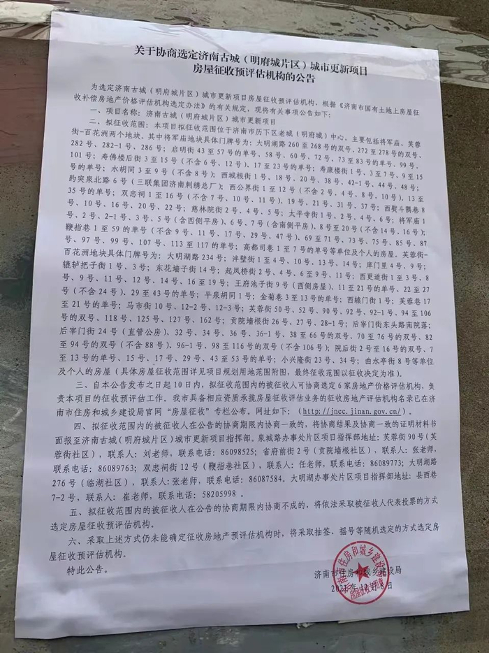 2021年12月6日,济南市住房和城乡建设局发布《关于协商选定济南古城(明府城片区)城市更新项目 房屋征收预评估机构的公告》。公告称,拟征收范围为济南市历下区老城(明府城)中心,主要包括将军庙、芙蓉街-百花洲两个地块。(山东商报·速豹新闻网记者 崔艳红)