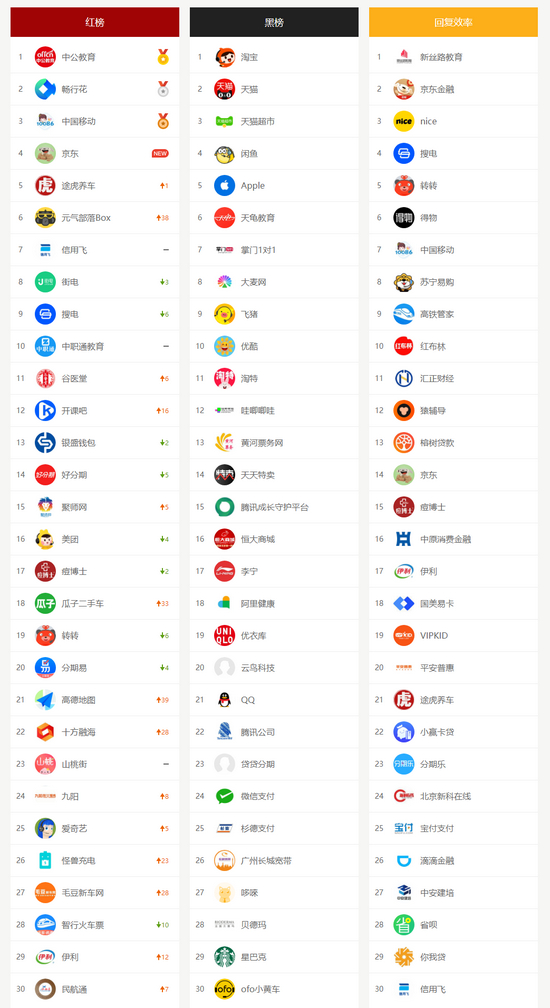 黑榜:大麦网、优酷、哇唧唧哇、黄河票务网、腾讯成长守护平台、QQ、腾讯公司、网易王牌竞速、秀动、世界街景3D地图