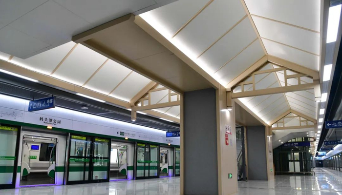 车站吊顶也别具一格,从码头潭文化遗址公园入手,提取明清古建筑造型特征,用现代手法和材质体现此地古今的繁荣特质。