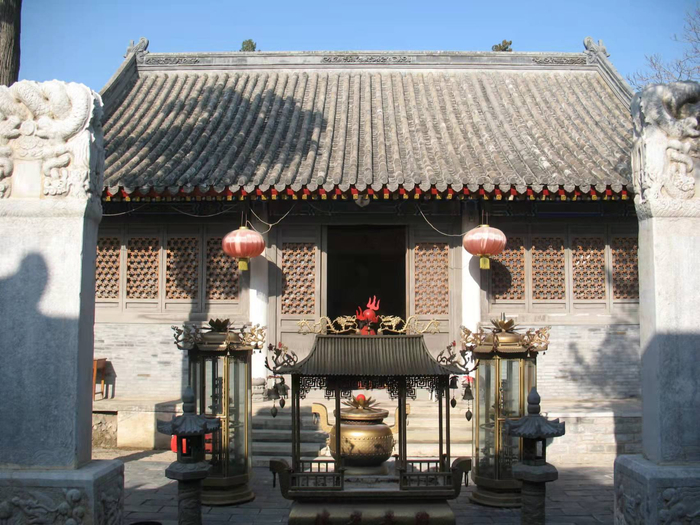 二进院是大雄宝殿,大殿为三间后抱厦,木质门窗,正脊上砖雕二龙戏珠图案。殿内正面佛龛下有释迦牟尼佛像,上世纪七十年代被毁。佛像后为悬山,悬山雕有青山绿水彩云,天上飞禽,地下走兽,宛如天堂仙境。旧时,进香拜佛的人们,总要到龛后仰望悬山,欣赏美景。今日所见悬山为后来复建。
