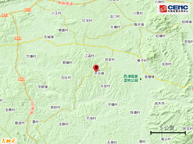 震中地形:震中5公里范围内平均海拔约129米。