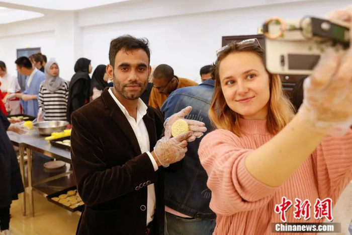 2019年9月,东北林业大学举办“体验中秋文化 感受中国味道”留学生庆中秋活动。图为留学生展示自己制作的月饼。中新社记者 吕品 摄