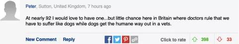 “我快92岁了,我觉得我想要个这个…但在英国这不可能,这里是医生说了算,我们必须像痛苦的狗一样在死前忍受许多痛苦,然而狗都能拥有一个人性化的离开方式。”