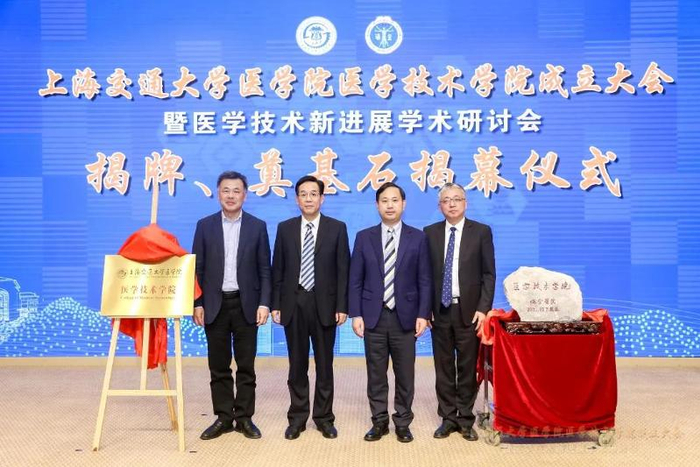 医学院党委副书记赵文华、附属第九人民医院院长吴皓为医学技术学院成立揭牌。医学院副院长胡翊群、附属瑞金医院党委书记瞿介明共同为奠基石揭幕。
