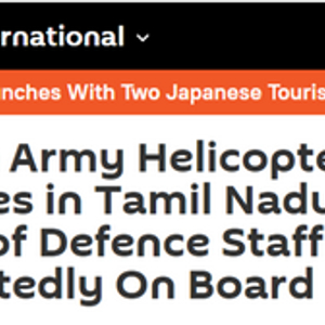 综合《今日印度》、《印度时报》、俄罗斯卫星通讯社等多家外媒报道,印军一架直升机当地时间8日在印度南部泰米尔纳德邦坠毁,机上有14人,其中包括印军最高将领、国防参谋长比平•拉瓦特 。