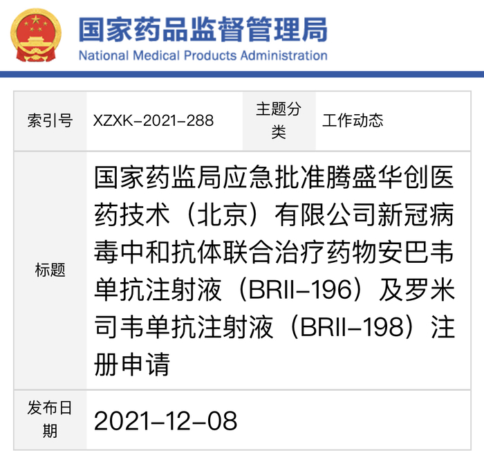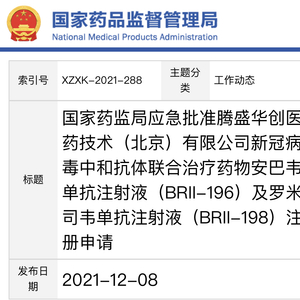 国家药品监督管理局网站显示,应急批准腾盛华创医药技术(北京)有限公司新冠病毒中和抗体联合治疗药物安巴韦单抗注射液(BRII-196)及罗米司韦单抗注射液(BRII-198)注册申请。