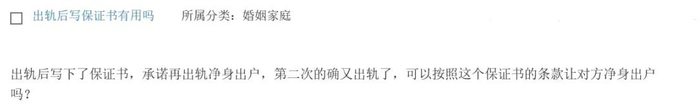 根据你的描述,出轨方在出轨后写下保证书,此种“净身出户”的保证书目的是对有出轨倾向的一方形成某种震慑,当其出轨后,对其施以财产性惩罚,旨在维系家庭和谐稳定,与夫妻忠诚义务的内在价值相吻合。该保证书实际上是以离婚为前提的财产分割协议,但由于涉及人身关系的解除,该保证书一般不具有法律效力。其中涉及财产分割的内容,如果是双方的真实意思表示且不违反法律强制性规定,不违反公序良俗,在离婚诉讼中,无过错方仍可以将该保证书作为证据提交。在司法实践中,法院在处理类似情形的案件时,如果出轨方对该保证书不予认可,法院亦不会轻易照此处理。