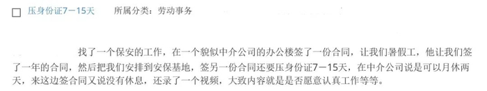 找到一份保安的工作,先在一个貌似中介公司的办公楼以暑假工的身份签了一年的合同,后又被安排到安保基地,签另一份合同,还要求押身份证7-15天。在中介公司时,对方说可以月休两天,来安保基地签合同时又说没有休息,还被要求录了一个视频,大致内容就是是否愿意认真工作等。这合适吗?