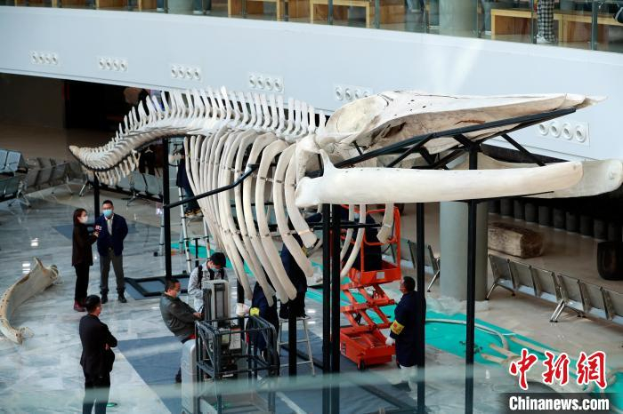 12月9日,长须鲸骨骼标本亮相上海自然博物馆,进行最后组装。 汤彦俊 摄