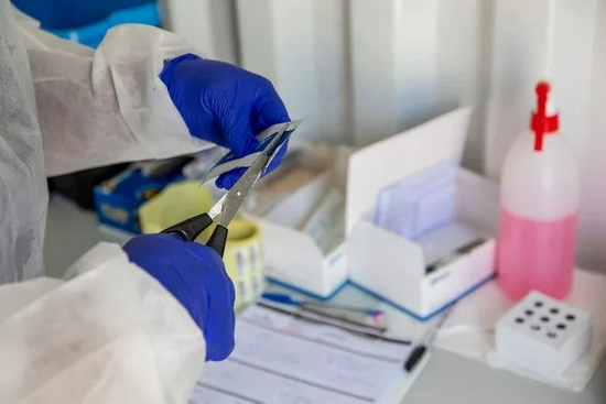 2021年12月2日,在南非开普敦Milnerton区Richmond Corner购物中心外的Testaro新冠流动检测点,一名卫生工作者打开检测材料的包装。