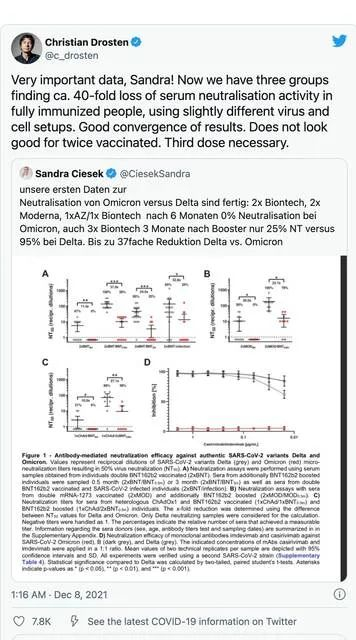 两针效果大打折扣位于德班的非洲卫生研究所(African Health Research Institute)在12月7日发布了首个结果,他们进行的一项研究测量了接受两剂辉瑞疫苗的人的血浆,发现其病毒阻断抗体的水平跟阻断疫情开始最初的流行毒株相比,下降了41倍。这项研究涉及了14份血浆样本,因此规模非常小。另外研究还发现,在约一年前感染新冠的部分参与者中,针对Omicron变体的中和抗体水平明显要更高。也就是说,仅以此项研究来说,自然感染针对Omicron的防再次感染能力似乎要好过两针辉瑞疫苗。法兰克福大学诊所医学病毒学研究所的病毒学家桑德拉·切塞克(Sandra Ciesek)在周三早些时候也发布了他们的研究结果,他说,德国研究人员支持南非的研究结果,他们发现抗Omicron抗体比抗Delta变种抗体减少为37分之一。