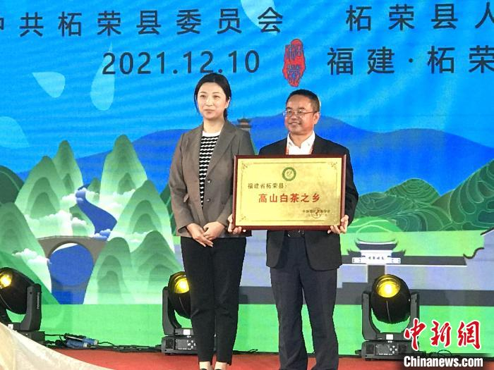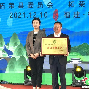 中新网福州12月10日电 (王东明 吴少宇)在10日于福州举行的“柘荣高山白茶”推介会上,中国茶叶流通协会副秘书长肖星向福建省柘荣县人大常委会党组书记陈龙营授牌,授予柘荣县“高山白茶之乡”称号。