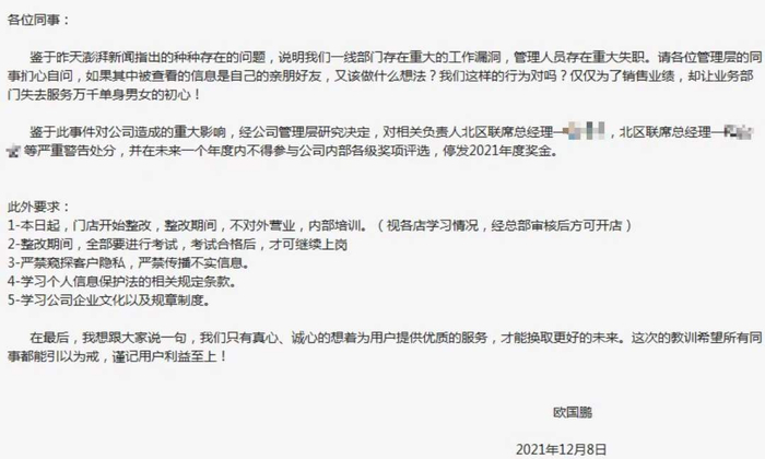 欧国鹏在文中开篇如是发问,“请各位管理层同事扪心自问,如果其中被查看的信息是自己的亲朋好友,又该做什么想法?这样的行为对吗?仅仅为了销售业绩,却让业务部门失去万千男女的初心!”并表示,公司高层决定,将对区域负责人等予以严重警告处分、停发年度奖金等处罚措施。