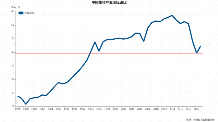 中国是传统的养猪大国,生猪存栏占全球比重超过一半,稳居世界首位,但近年来首位度有所下降。2014年,中国生猪存栏占全球比重达到最高峰,占58.61%,随后持续回落;2018年,占55.53%。受非洲猪瘟疫情冲击,2019年、2020年,分别下降至49.17%、44.68%。