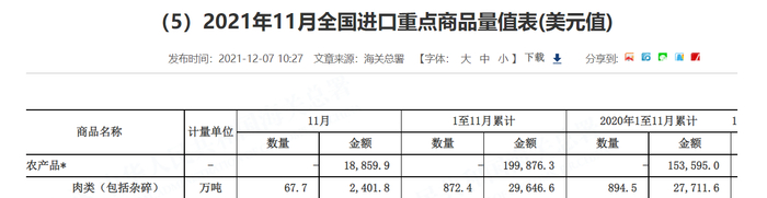 12月7号,海关总署发布数据,1~11月,肉类(包括杂碎)进口872.4万吨,去年同期894.5万吨,同比下降2.5%。在这些进口的肉类中,猪肉占比最大。其中,西班牙是中国最主要的猪肉进口国,占比超过30%。