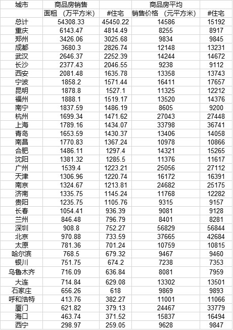 第一财经梳理发现,在住宅商品房销售面积方面,重庆、郑州、成都、武汉、长沙位居前五。四个一线城市中,上海供应量最多,而深圳和北京均不足800万平方米。
