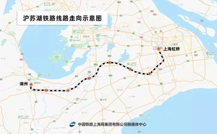 沪苏湖铁路起自上海虹桥站,途经江苏省苏州市,终至浙江省湖州市湖州站,设上海虹桥、松江南、练塘、汾湖、盛泽、南浔、湖州东(纳入湖杭铁路工程)、湖州8个车站,其中上海虹桥站和湖州站为既有车站,其他为新建中间站。