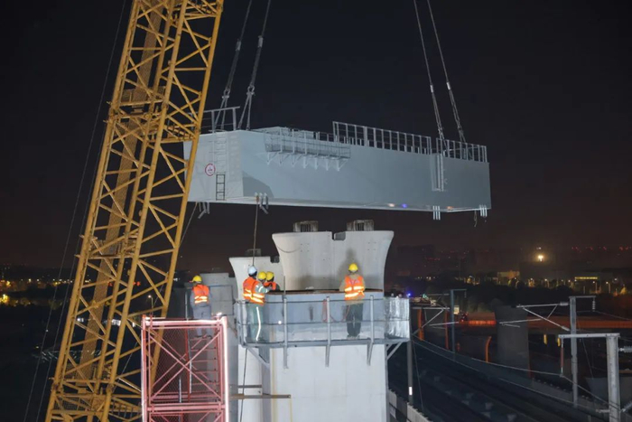 11月23日凌晨,随着最后一片钢横梁架设到位,江苏南沿江城际铁路上跨宁杭高铁13榀钢横梁吊装施工顺利完成。目前,项目正进行南沿江城际铁路站前5标8千米滆湖段施工,预计12月底该标段连续梁全部合龙,明年1月上旬箱梁架设全部完成。