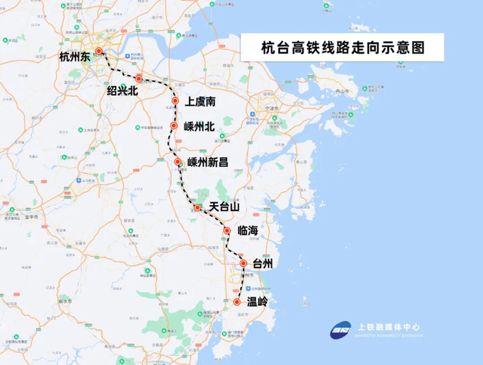 杭台高铁是国家沿海铁路快速客运通道的重要组成部分,连接杭州、绍兴、台州三地,北起杭州东站,利用杭甬高铁至绍兴北站,之后新建正线至台州市温岭站,设计时速350公里,线路全长约266.9公里,其中新建线路约226.3公里,设绍兴北、上虞南、嵊州北、嵊州新昌、天台山、临海、台州、温岭8座车站,每座站房都充分融合了当地特色文化元素,实现了“一站一景”。