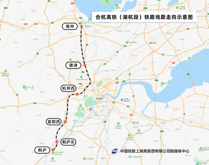 合杭高铁湖杭段是2022年杭州亚运会重点配套工程和“轨道上的长三角”重要节点工程,线路从既有宁杭高铁湖州站引出,经湖州市南太湖新区、吴兴区、德清县,杭州市余杭区、西湖区、富阳区和桐庐县,跨富春江经新设桐庐东站后引入杭黄高铁桐庐站,设计时速350公里,新建线路长约136公里。