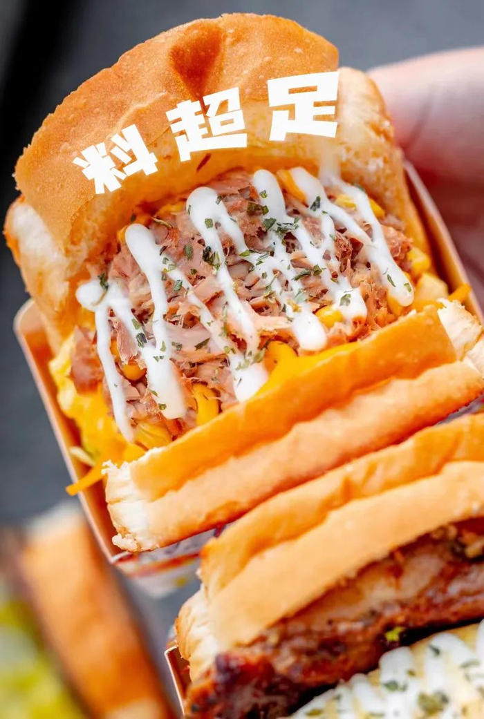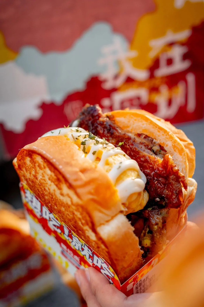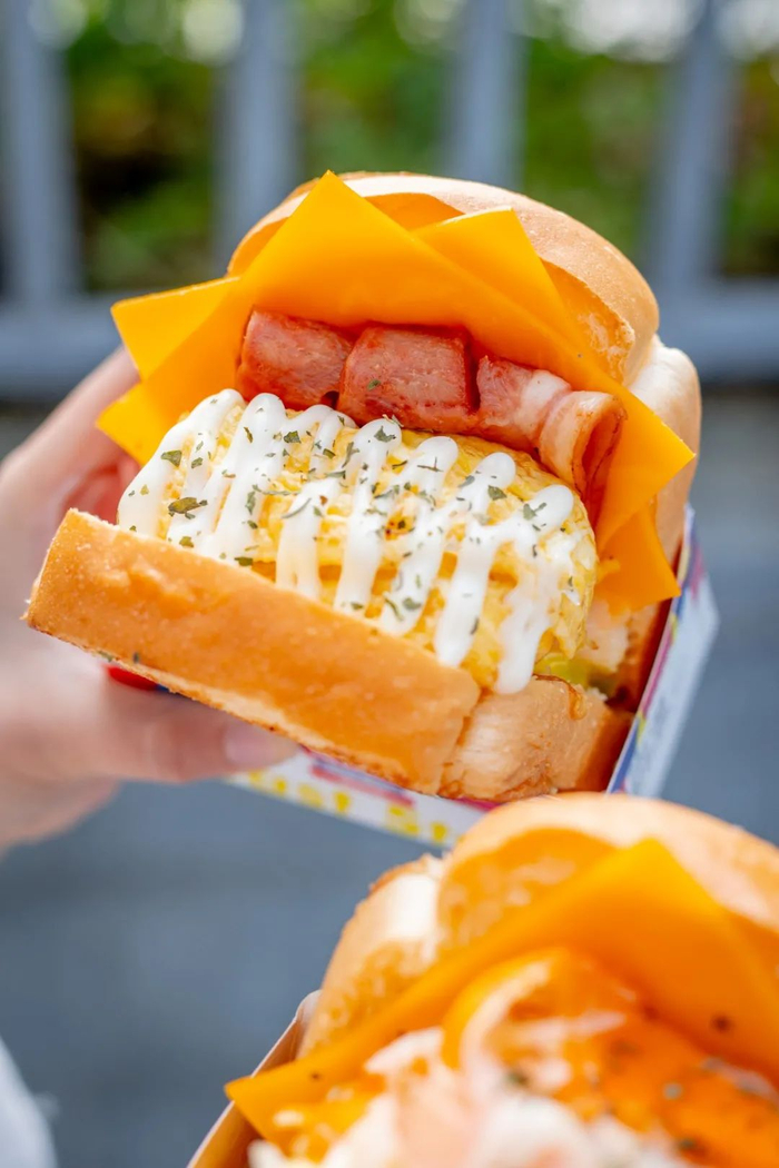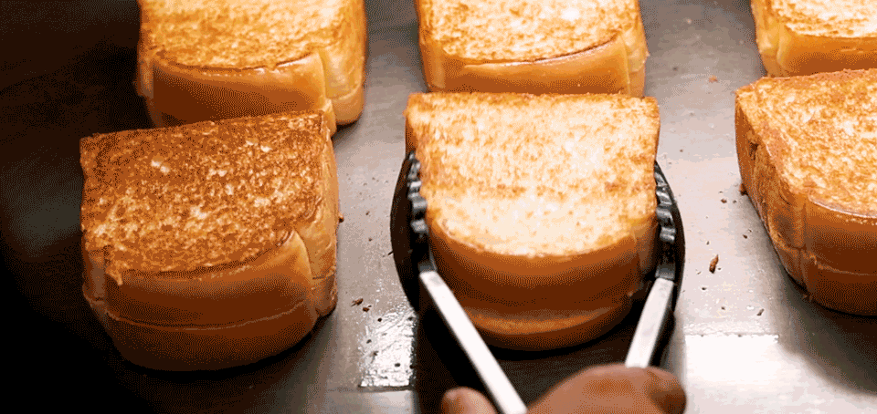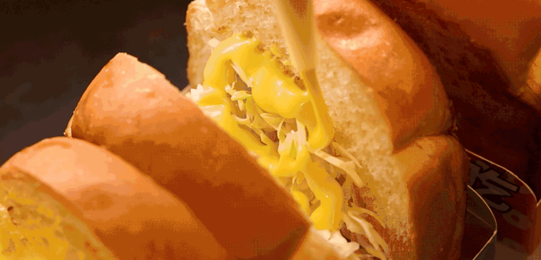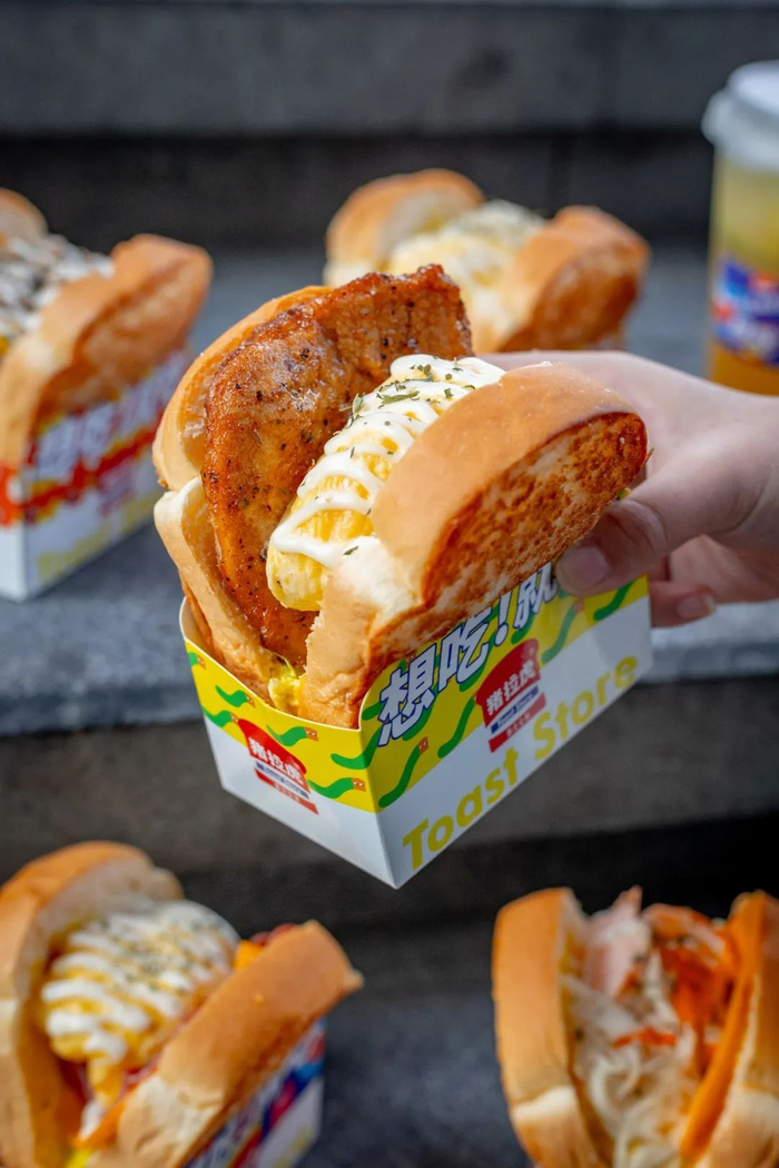 腌制过的猪扒放在高温烤炉上煎的油滋冒泡,全部金黄的时候,就和厚蛋一起塞满整个吐司外皮,咬上一口,外酥里嫩,简直是元气炸弹吧!