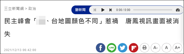 据路透社12月13日报道,在美国总统拜登上周举行的“民主峰会”视频会议上,台“行政院政务委员”唐凤演讲PPT所引用地图,公然将大陆和台湾标注为两种颜色。这一小动作惹来白宫不满,随后,唐凤视频画面被掐断,改为音频代替。
