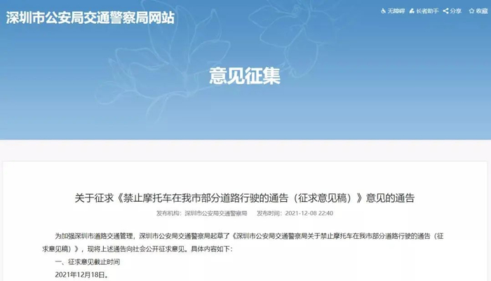 深圳市公安局交通警察局在其官网发布了《深圳市公安局交通警察局关于禁止摩托车在我市部分道路行驶的通告(征求意见稿)》,(以下简称《征求意见稿》)向社会公开征求意见。