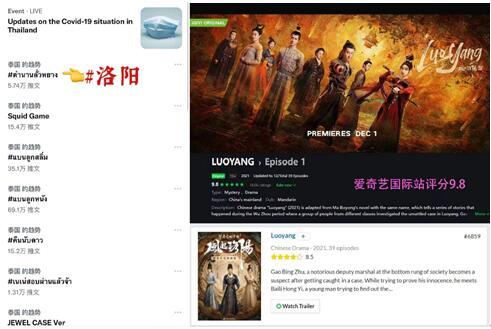 《风起洛阳》自开播以来,已不仅在国内火热,还火出了国界,定档时在泰国、新加坡、越南、韩国均登上推特趋势;剧集上线后,在泰国,韩国登上了推特热搜;在全球最大的亚洲影剧社群资料库MyDramaList,开播即获9.3分的评分……