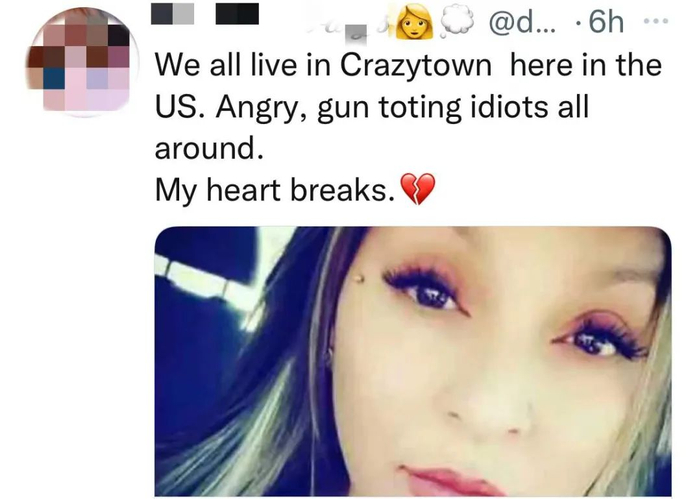 就连听惯了枪支暴力的美国人也震惊了。一名网友贴上蒙特斯的生前照片和一个心碎的表情符号说:“在美国,我们都生活在疯狂的城市。到处都是暴躁的、带着枪的傻瓜。”