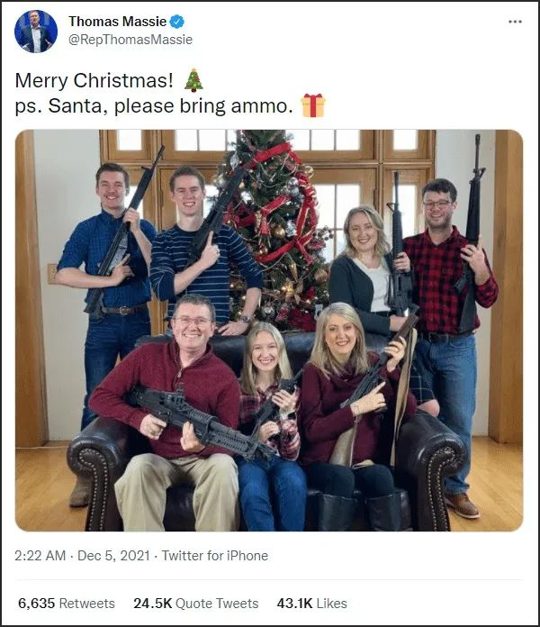 蒙特斯几声鸣笛引发的枪声会震动美国的枪支文化吗?希望如此,然而大概率不会。毕竟就在这场悲剧发生不久前,11月30日,美国密歇根州刚刚爆出一名15岁男生射杀4名学生的血腥枪案,而几天后的12月5日,共和党肯塔基州众议员托马斯·马西就在社交媒体贴了一张人人端着枪、喜气洋洋的圣诞全家福,还向圣诞老人索要礼物——“更多的子弹”!