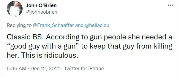 蒙特斯事件发生后,一名网友的愤怒评论反映了美国支持拥枪群体的逻辑:“典型的狗屁话。拥枪的人们说,她(蒙特斯)需要的是一个‘拿着枪的好男人’,这样就可以保护她不被射杀了。真是荒谬。”
