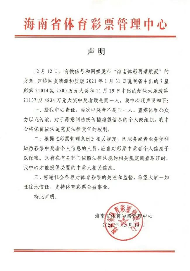 12月13日深夜,海南体彩中心在其官方发布声明回应了“两位大奖得主是同一人”的质疑,声明表示:“12月12日有微信号和网媒发布‘海南体彩再遭质疑’的文章,声称网友猜测和质疑2021年1月31日晚海南省中出的7星彩第21014期2500万元大奖和11月29日中出的超级大乐透第21137期4834万元大奖中奖者疑是同一人。据查证,两次中奖者不是同一人。望媒体和公众勿以讹传讹。对于恶意制造或传播虚假信息的个人或组织,将保留依法追究其法律责任的权利。”