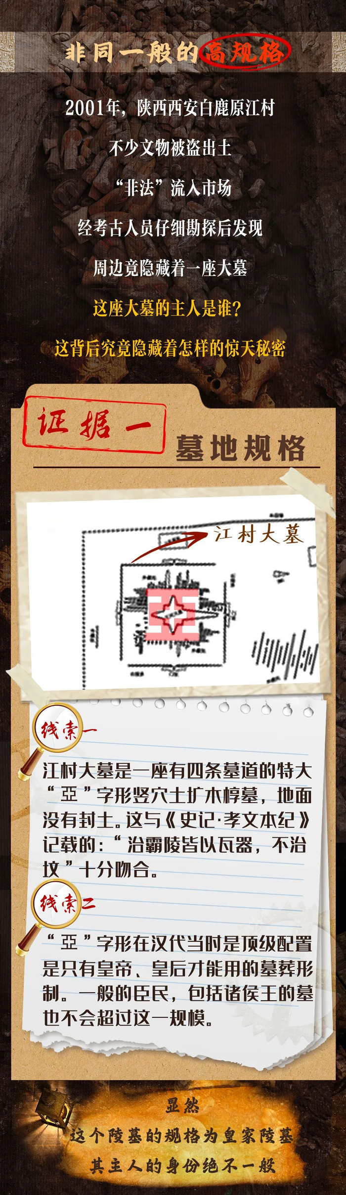 进一步考古勘探发现,江村大墓东西墓道总长度达250米,从墓葬形制来讲属于顶级配置,超越了公主甚至诸侯王。