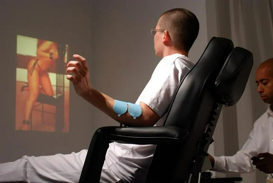治疗开始前,研究人员会在克里斯的手腕和脚腕套上电极。准备结束后,大屏幕亮起,依次打出帅哥或靓女的幻灯片。