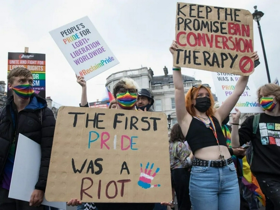 2021年7月24日,伦敦特拉法加广场,人群集会反对性向转换治疗