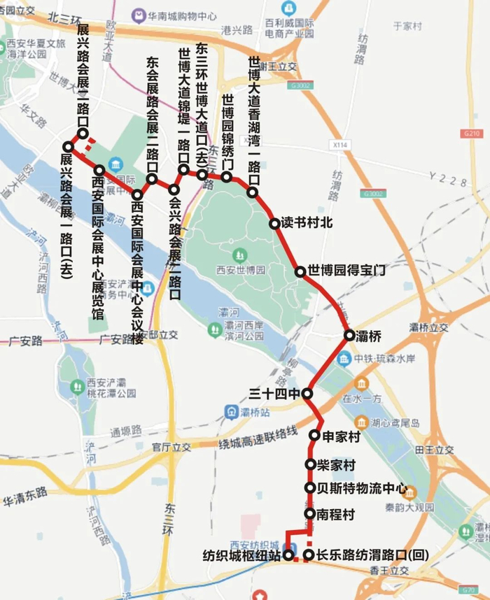 由纺织城枢纽站发车,经柳鸣路、柳韵巷、纺渭路、柳烟路、东城大道、世博大道、会兴路、会展二路、东会展路、会展一路、展兴路至展兴路会展二路口;回程展兴路会展二路口发车,会展二路、西会展路、会展一路、东会展路、会展二路、会兴路、世博大道、东城大道、柳烟路、纺渭路、长乐东路、柳鸣路至纺织城枢纽站。线路长度11.6公里。