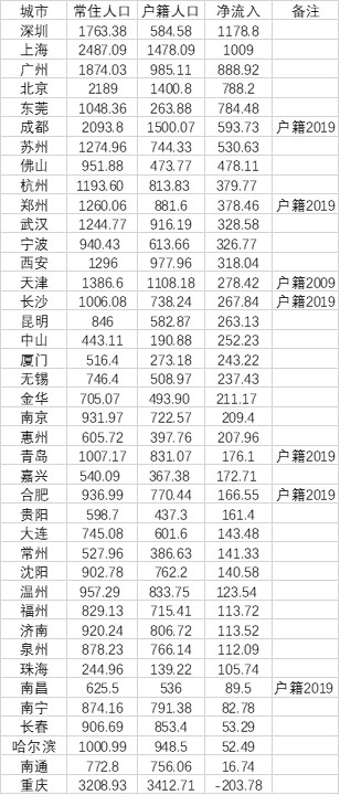 需要说明的是,一个地方的户籍人口总有一部分流出,即便是北上广深这样的发达大城市,也会有一部分户籍人口在外地。因此,这些城市外来常住人口数据会大于人口净流入的数值。其次,由于各地落户的门槛不同,一些二线城市落户门槛较低,因此这些地方的户籍人口中,有很多是近年来落户的人口,总体上这些地方的人口流入要比净流入数据更多。