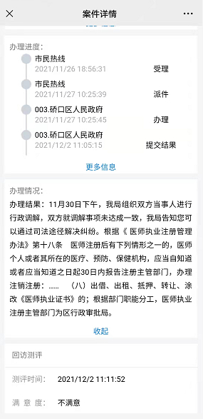 12月2日,硚口区卫健局表示,11月30日下午,该局已组织双方当事人进行了行政调解,但双方就调解事项未达成一致,双方可通过司法途径来解决纠纷。“另根据部门职能分工,医师执业注册主管部门为区行政审批局。”