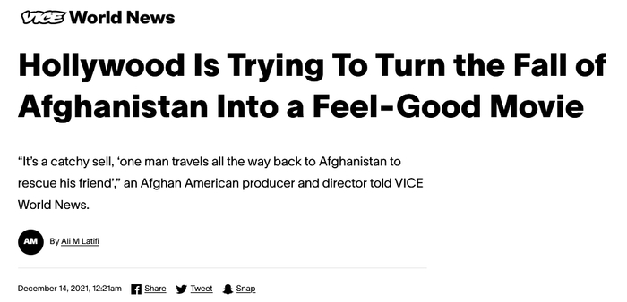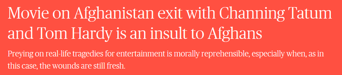 这部影片官宣后,NBC新闻发文称拍这种电影是对阿富汗人的侮辱,“利用现实生活中的悲剧来娱乐,在道德上应该受到谴责。尤其是在这种伤口还未完全愈合的情况下。”