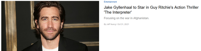 他还透露,这正是好莱坞名导盖·里奇(Guy Ritchie)明年1月开拍新电影的动机,杰克·吉伦哈尔(Jake Gyllenhaal)将出演这部动作惊悚片《翻译风波》(The Interpreter),电影将讲述一名美国士兵完成任务后,返回阿富汗营救一名曾救过他命的阿富汗翻译。