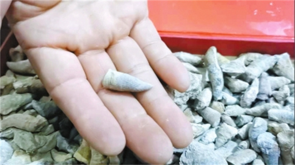 ①王德顺展示他收集到的牛角珊瑚化石