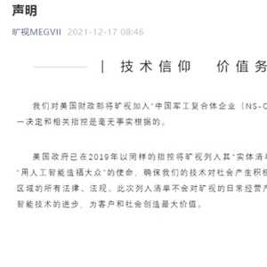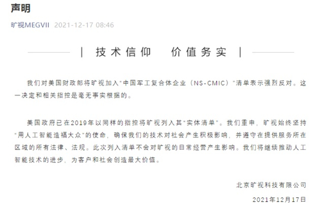 旷视科技发布声明称,我们对美国财政部将旷视加入“中国军工复合体企业(NS-CMIC)”清单表示强烈反对。这一决定和相关指控是毫无事实根据的。”美国政府已在2019年以同样的指控将旷视列入其“实体清单”。我们重申,旷视始终坚持“用人工智能造福大众”的使命,确保我们的技术对社会产生积极影响,并遵守在提供服务所在区域的所有法律、法规。此次列入清单不会对旷视的日常经营产生影响。我们将继续推动人工智能技术的进步,为客户和社会创造最大价值。