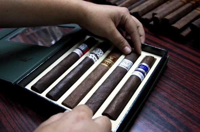 制作雪茄的工序繁多,首先把采摘回来的烟叶晾干,去除烟叶上粗壮的叶脉,再选出质量最上乘、柔韧性最好的烟叶做外卷叶,把其他烟叶初卷成型,用模具压制成型,最后包上外皮,一支飘着烟草香气的雪茄就做好了。