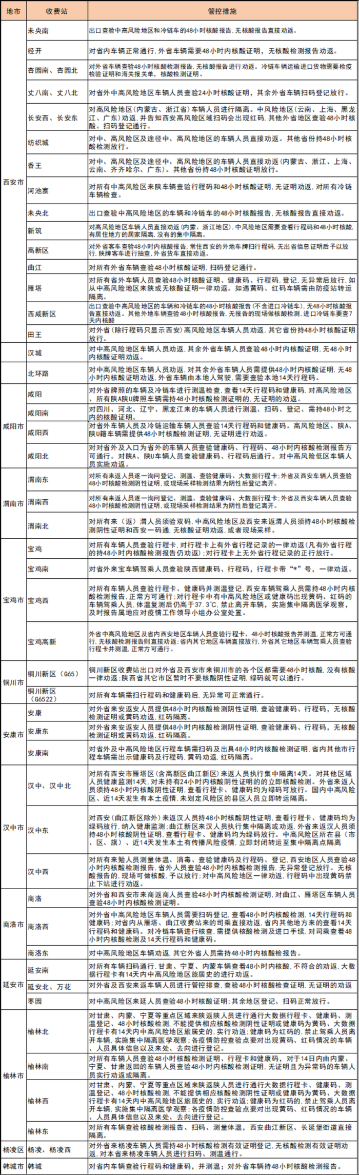 1.西安绕城高速:新筑收费站出口对高风险地区车辆人员直接劝返(内蒙、浙江地区),中风险地区需要查看行程码和48小时核酸,有居住地方的居家隔离,没有的集中隔离。未央北、未央南查验中高风险地区的车辆和冷链车的48小时核酸报告,无核酸报告直接劝返。杏园南、杏园北对外省车辆查验48小时核酸检测报告,无核酸报告进行劝返。冷链车辆运输进口货物需要检疫检验证明和海关报关单,核酸检测证明。经开收费站出口对省内车辆正常通行,外省车辆需要48小时内核酸证明,无核酸检测报告劝返。西咸新区收费站出口查验中高风险地区的车辆和冷链车的48小时核酸报告(不含进口冷链车),无48小时核酸报告直接劝返。其他外地车辆查验48小时核酸报告,无报告的现场做核酸检测,进口冷链车要查7天内核酸检测。河池寨收费站出口对所有中高风险区来陕车辆查验行程码和48小时核酸证明,无证明劝返,对所有冷链车辆检查。丈八南、丈八北收费站出口对省外中高风险地区车辆人员查验24小时核酸证明,其余外省车辆扫码登记放行。高新区收费站出口对外省客车查验48小时内核酸报告,常住西安的外地车牌扫行程码,无出省信息证明后予以放行,陕牌客车进行抽查,外省货车直接劝返。长安西、长安东收费站出口对高风险地区(内蒙古、浙江省)车辆人员进行隔离。中风险地区(云南、上海、黑龙江、广东)劝返,并告知西安高风险区域扫码会出现红码,其他外省地区查验48小时核酸。扫码登记通行。雁塔收费站出口对所有省外车辆人员查验48小时核酸证明、健康码、行程码,登记,无异常后放行,如从中高风险地区来陕或无核酸证明一律劝返。如遇黄码、红码车辆需由防疫站转运隔离。曲江收费站出口对所有外省车辆查验48小时核酸证明,扫码登记通行。香王对中、高风险区及途径中、高风险地区的车辆人员直接劝返(内蒙古、浙江、上海、云南、齐齐哈尔、广东)。其他省份持48小时核酸证明放行。纺织城收费站出口对中、高风险区及途径中、高风险地区的车辆人员直接劝返。其他省份持48小时核酸检测放行。田王收费站出口对外省(除行程码只显示西安)高风险地区车辆人员劝返,其它省份持48小时核酸证明放行。
