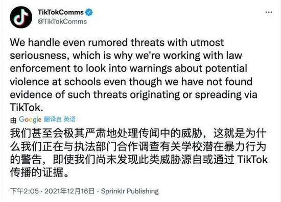 该声明称:“即使只是谣传的威胁,我们也会予以极其慎重的处理,正因为此,尽管我们没有发现这些威胁源自或通过TikTok传播的证据,我们仍在与执法部门合作,调查学校潜在暴力的警告。”