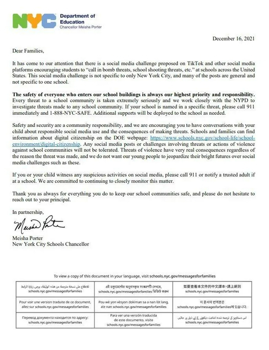 纽约市教育局通过学校发给家长的关于应对TikTok威胁的信。